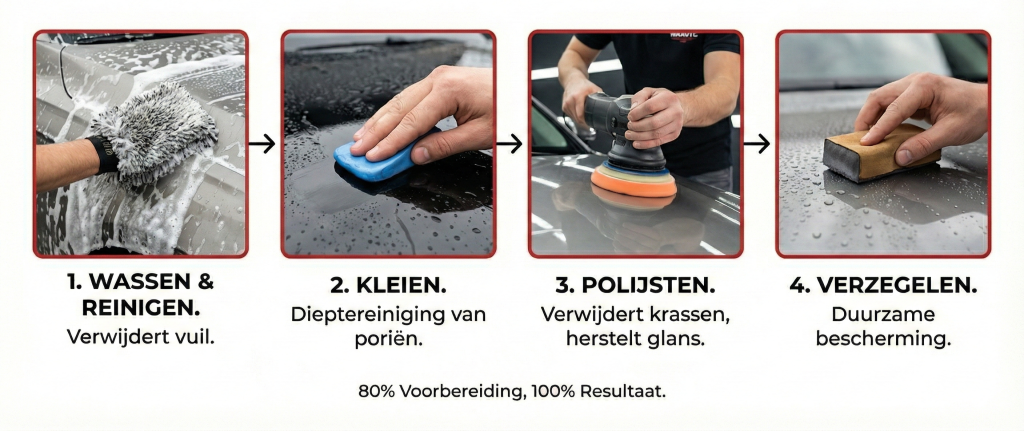 Het Proces: Dieptereiniging, machinaal polijsten (lakcorrectie) en daarna verzegelen.